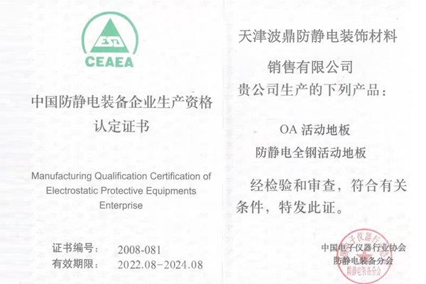 中國(guó)防靜電裝備企業(yè)生產(chǎn)資格認(rèn)定證書